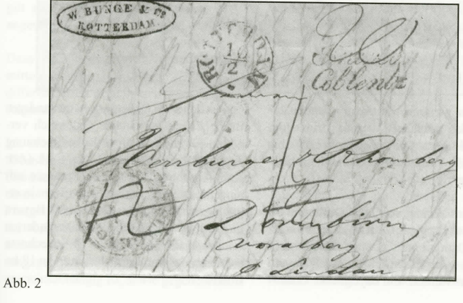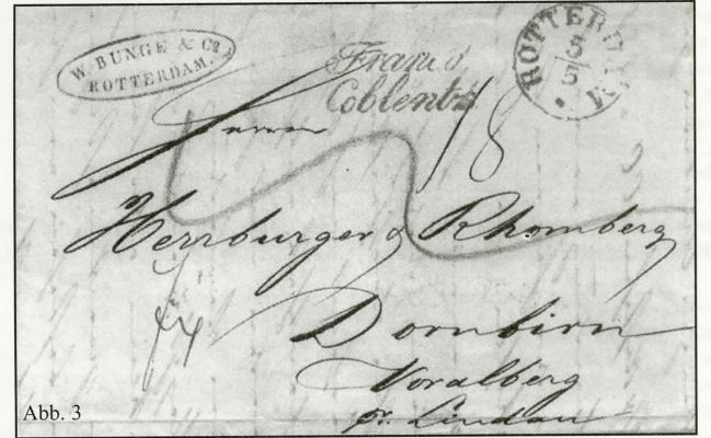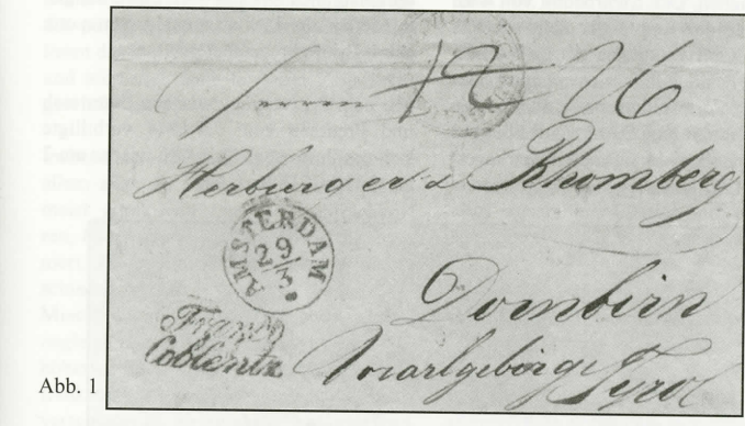 Obwohl alle nachfolgend abgebildeten Briefe der 1. Gewichtsstufe zuzuordnen sind, musste der Empfänger in Dornbirn jeweils eine unterschiedlich hohe Portobelastung übernehmen. Die Niederlande behandelten die Briefe nach dem Vertrag Niederlande - Preussen vom 30. Juli 1817. Nach Art. XIV waren Briefe nach Österreich bis Coblenz zu frankieren. Deshalb wurde für jeden einfachen Brief mit dem Leitweg über Arnheim, zusätzlich zum Porto bis zur niederländischen Grenze (Amsterdam = 20 Cent, Rotterdam = 25 Cent) eine Gebühr von 25 Cent erhoben. Vom bezahlten Franco von 45 bzw. 50 Cent erhielt Preussen für seinen Transit jeweils 4 Silbergroschen. Obwohl ab 1.10.1837 die Post zwischen Preussen und Österreich direkt ausgetauscht wurde, gingen Briefe nach Vorarlberg weiterhin im offenen Transit durch Bayern. (Preussisches Circular vom 11. September 1837). Über Arnheim, Emmerich, Coblenz und Aschaffenburg gelangte der folgende Teilfrankobrief vom 29.3.1842 (Abb. 1) nach Augsburg. Dort nahm Bayern für seinen Transit 12 kr. rhein. in Auslage. Nach § 17 i.V.m. der Transitporto-Tabelle (Lit. G), Postvertrag Bayern - Preussen vom 30.11. 1834, vergütete Bayern an Preussen für die Beförderung von Coblenz bis Aschaffenburg 6 kr. = l 3/4 Sgr.Obwohl Bayern lt. Vertrag mit Österreich von 1819 nur 12 kr. C.M. zustanden, belastete Österreich den Empfänger mit 14 kr. C.M. (Dekret v. 21.5.1819, siehe POSTGESCHICHTE, Nr. 99, S. 34). Zuzüglich des österreichischen Inlandportos von 2 kr. C.M. (1. Entfernungsstufe bis einschl. 3 Poststationen, Regulativ vom 1.6.1817) musste der Empfänger schliesslich 16 kr. C.M. entrichten.