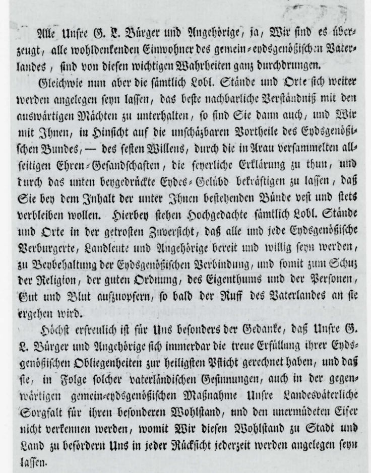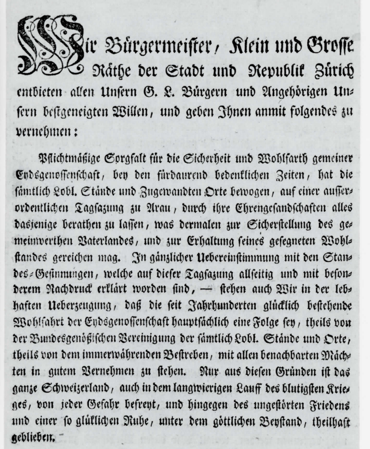 6.1.1798 Erklärung, die Eidgenossenschaft nötigenfalls mit Waffengewalt zu verteidigen. (Die ersten franz. Truppen marschierten trotzdem bereits am 25.J26.1.1798 in die Schweiz ein und konnten nicht aufgehalten werden.)