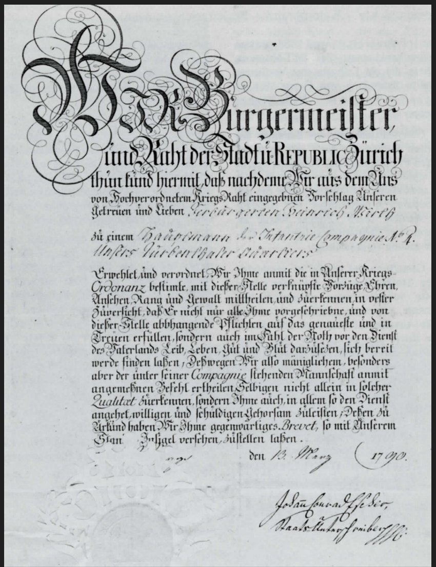 13.3.1790 Ernennungsurkunde eines Hauptmanns des Turbenthaler Quartiers