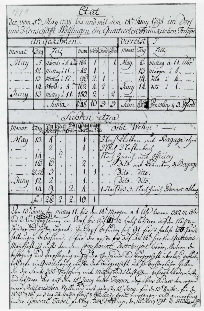 5.5.1798 Rapport über den Bestand der vom 5.5. bis 16.6. zu Wölflingen einquartierten fränkischen Truppen.
