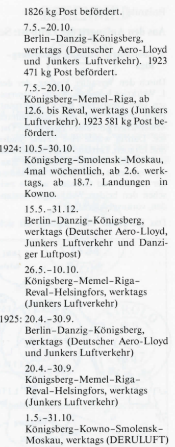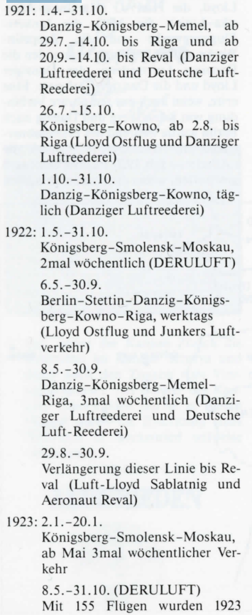 Das Entstehen vieler kleiner, oft sich konkurrierender Fluggesellschaften war typisch für das Deutschland der Jahre 1919/20. Hinter ihnen standen Kapitalgesellschaften wie der Norddeutsche Lloyd, die HAPAG (Hamburg-Amerika-Linie), die AEG, die JunkersFlugzeugwerke und die ZeppelinWerke. Allein in Danzig entstanden die Danziger Luftreederei, der Danziger Lloyd und die Danziger Luftpost. Eine erste, wenn auch nur temporäre Verbindung von Königsberg und Danzig nach Berlin wurde während des Eisenbahnerstreiks im November 1919 durch die «Albatros» (ab 1920 «LlOyd Ostflug») geschaffen, wobei die Post zuschlagsfrei befördert wurde. Der regelmässige Verkehr wurde am 27.12.1920 durch die Lloyd Ost flug und die Deutsche Luftreederei eröffnet und über den ganzen Winter aufrechterhalten. Zahlreich sind die Linien, die ab Danzig und Königsberg ostwärts in den folgenden Jahren in Betrieb kamen: