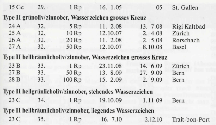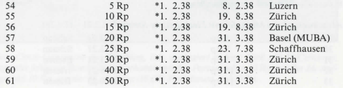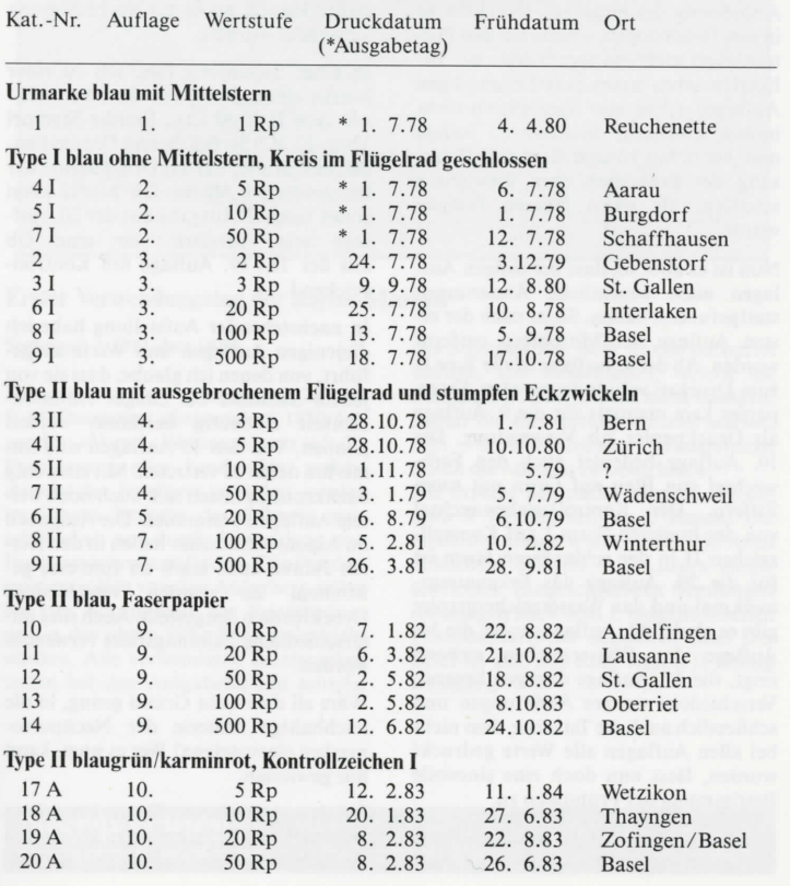 Ähnlich wie bei den Rayon-Marken nach Drucksteinen gesammelt wird, werden die Nachportomarken nach den einzelnen Auflagen geordnet. Ist es bei den Rayon-Ausgaben die Zeichnung nebst Farbe, die den Anreiz zur Spezialisierung bietet, so ist es nebst Farbe die Anordnung der einzelnen Druckstöcke in den Druckbogen, welche bei den Portomarken meistens verschieden ist. Bei Einzelmarken lassen sich die jeweiligen Auflagen selbst von Spezialisten nicht immer eindeutig bestimmen, sodass man vermuten könnte, dass eine Erfassung der Frühdaten eher Verwirrung schaffen, als einen Nutzen bringen würde. Nun ist es aber so, dass bei einigen Auflagen auch wesentliche Änderungen stattgefunden haben. So ist nach der ersten Auflage der Mittelstern entfernt worden. Ab der 4. Auflage ist die Type II zum Drucken verwendet worden. Faserpapier kam erstmals für die 9. Auflage als Druckpapier zur Verwendung. Die 10. Auflage bedeutet auch den Farbwechsel von Blau auf Grün mit roten Ziffern. Der Kontrollzeichenwechsel von der breiteren Form I auf Kontrollzeichen II in der schlankeren Form ist für die 20. Auflage das Erkennungsmerkmal und das Wasserzeichenpapier gibt es ab der 32. Auflage, wobei die 34. Auflage das Wasserzeichen stehend zeigt, die 35. Auflage dagegen liegend. Verschiedene weitere Änderungen und schliesslich auch die Tatsache, dass nicht bei allen Auflagen alle Werte gedruckt wurden, lässt nun doch eine sinnvolle Bestimmung der Frühdaten zu. Die Ausgabedaten sind mit Ausnahme der ersten zwei Auflagen und der Ausgabe von 1938 nicht bekannt. Was hingegen bekannt ist, sind die Druckdaten. Mit den Frühdaten lässt sich eruieren, wie lange es gedauert hat, bis die Marken nach dem Druck - über das Gummieren, Schneiden, Perforieren, Trennen und Verpacken - nun an die Poststellen kamen, wo sie zur Nachtaxierung verwendet wurden. In einer Sammlung fand ich zu einer Marke einen Zettel mit dem Vermerk: «E Type II K 50 Cts., Ersttag-Stempel Vevey 17. V. 95». Bei diesem Datum handelt es sich aber um das Druckdatum der beschriebenen Marke. Die Marke kann somit keine E-Ausgabe aus der 20. Auflage sein, sondern war eine Db aus der 18./19. Auflage mit Kontrollzeichen I. In nachstehender Aufstellung habe ich diejenigen Auflagen und Werte aufgeführt, von denen ich glaube, dass sie von jedem Sammler bei einiger Aufmerksamkeit eindeutig bestimmt werden können. Von den 35 Auflagen sind immerhin deren 23 vertreten. Mit ein wenig Sachkenntnis lassen sich auch noch weitere Auflagen bestimmen. Die Ausgaben im Alpenrosenmuster haben in den letzten Jahren auch stark an Interesse gewonnen. Es wurden verschiedene Druckformen festgestellt. Auch sind unterschiedliche Zähnungsriese verwendet worden. Wäre all dies nicht Grund genug, in die reichhaltige Materie der Nachportomarken einzusteigen? Wer es wagt, kann nur gewinnen. Bei den angegebenen Daten handelt es sich meist um Einzelmarken. Es wurden deshalb nur Daten verwendet, die auf mehreren Marken nahe beieinander belegt waren. Einzelne weitere Frühdaten sind noch bekannt, doch in der Tabelle als Einzelstücke mit extrem frühem Datum noch nicht berücksichtigt. Sammler, die Marken mit früheren Daten besitzen, bitte ich um Vorlage der Originale, damit die Tabelle verbessert werden kann. Zu einem späteren Zeitpunkt werde ich auch die Frühdaten der Portofreiheitsmarken publizieren, sind doch diejenigen von 1911 mit den gleichen Druckstöcken gedruckt worden, wie die Portomarken von 1910!
