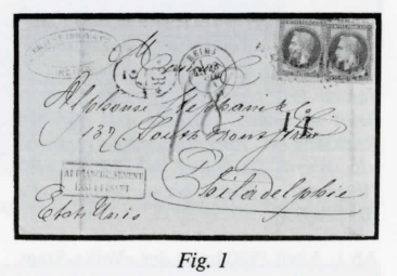 Par l'expiration de la convention entre la France et les Etats-Unis le 31 decembre 1869, il n'y avait plus de decompte entre les deux Offices. Toutes les lettres non affranchies etaient acheminees obligatoirement par la voie de l'Angleterre, sous le reglement de la convention Franco-Britannique du 21.9.1869. Les taux de livraison pour lettres non affranchies de la France vers les EtatsUnis par la voie d'Angleterre etaient de 2 Francs par once britannique, ce qui representait le poids de 4 lettres. L'Angleterre comptait par lettre acheminee 50 Centimes ou 10 cents (americains), = 14 de 200 cts. A ce port on ajoutait 2 cents pour port anglais (interne) et 2 cents pour port de mer, pour arriver ä 14 cents (americains) somme qu'on reclamait aux Etats-Unis, en utilisant un cachet «14» en encre noir, appose sur chaque lettre. Les lettres pesantes ne doublaient que le port du ä la France: 2 x 10 cents + 2 cents (GB interne) + 2 cents (port de mer) = 24 cents, ce montant sous forme de cachet «24» en noir. Les marques frangaises d'echange francaises apposees sur ces lettres existent en 4types: FR/2F. Elles sont signalees par Salles sous les numeros 3082/83 et 3124/25, les premieres en forme ovale, les autres en fer ä cheval.
