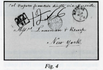L'article 39 des articles additionnels du 1.1.1862 stipule une taxe de livraison de l f. 78 c. pour les lettres d'Italie, transitant la France en destination d'Angleterre. La marque correspondante de Fr./l F 78C, se trouve sur le courrier non affranchi vers les Etats-Unis par voie d'Angleterre. A nouveau nous constatons que la quote-part due ä la Grande Bretagne se compose de 1,78 f: 4 = 0,445 f = 8 cents + 2 c. GB interne + 2 c. port de mer = 12 cents. Nous retrouvons ces 12 cents en crayon bleu au coin superieur gauche de la lettre figure 4, de Messina le 12.3.1870 par Marseille et Londres ä New York.