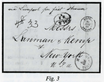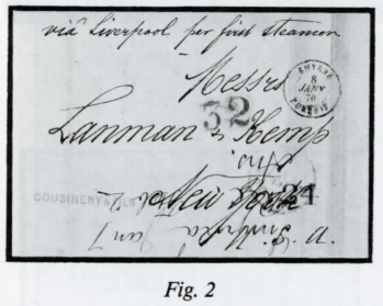 La lettre reproduite en figure 2 vient de Smyrne, avec cachet de depart du bureau francais, le 8.1.1870. Envoyee vers l'Angleterre sans marque d'echange francaise eile füt frappee ä Londres «24», au coin inferieur droit, exprimant laquote-part pourla lettre double: 10 + 10 cents + 2 c. port GB + 2 c. port de mer. Arrivee ä New York eile est marquee du cachet «32» (US Notes), monnaie depreciee. Comme la lettre precedente nous montre l'absence d'une marque d'echange, d'autres en transit par la France vers les Etats-Unis nous donnent differentes marques, non citees par Salles pour cette voie d'Angleterre.