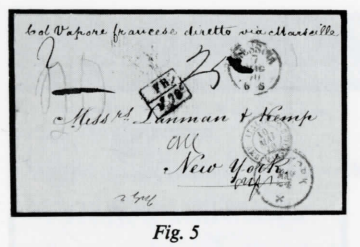 Figure 5 nous montre la double lettre de cette serie et comme ci-devant ce n'estque le port du ä la France qui double: 8 + 8 = 16 cents + 2 c. (GB) + 2 c. port de mer = 20 cents, en crayon bleu sur lettre de Messina du 7.5.1870. Au coin gauche superieur «2»: double, ä NewYork, le cachet ä date du 24 Mai et «25» US notes en monnaie depreciee.