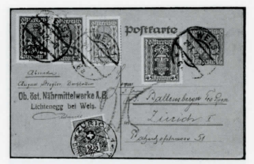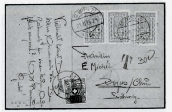 Abb. 11: Minimaltaxierung 25 Rappen. Karte von 1922 aus Österreich, mit 350 statt 360 Kronen frankiert, dies bei einem Briefporto von 600 Kronen bezw. 40 Rappen, nach Formel 2:10:600 Kronen x 40 x 2 Rappen = l'/3 Rappen Fehlbetrag! Taxmarke ZU35.