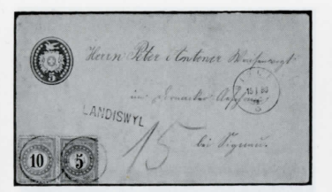 Abb. 1: Brief, mit 5 statt 10 Rappen frankiert und nach der «.teuersten» Formel l taxiert: 2 x 10 - 5 = 15 Rappen Taxe. Taxmarken ZU4IN, SIKaufTüblibrief