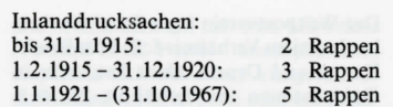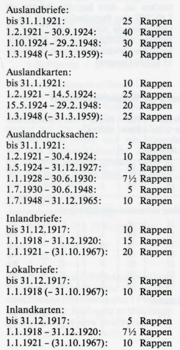 Auch in der Schweiz traten Änderungen ein. In der Taxmarkenzeit gab es folgende Porti: