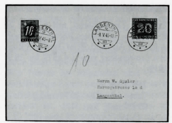 Abb. 18: Seit dem 7. Mai 1945 wurde für Post, die mit nicht mehr gültigen oder noch nicht gültigen Marken frankiert war, nur noch der einfache Fehlbetrag nach Formel 3 erhoben. Brief vom 8. Mai 1945 mit einer erst ab 9. Mai gültigen Pax-Marke (im übrigen für einen Lokalbrief überfrankiert), nach Formel 3 für das einfache Lokalporto von 10 mit ebenfalls 10 Rappen taxiert. Der Brief ist zweifellos philatelistischen Ursprungs, zeigt aber sehr schön die Anwendung der neuen Regelung. Taxmarke ZU55y.
