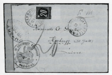 Abb. 4: Nicht (statt mit 10 Rappen) frankierter Brief, nach der Formel 4 taxiert: 2 xlO = 20 Rappen. Taxmarke ZU 19BK.