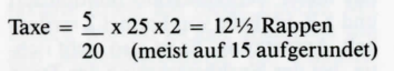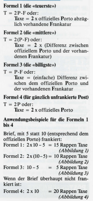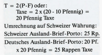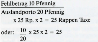 Diese zuletzt dargestellte Berechnungsmethode, bei welcher wir den ausländischen Fehlbetrag zunächst durch das ausländische Ausland-Brief-Porto dividieren und hernach mit dem Schweizer Ausland-Brief-Porto multiplizieren, empfiehlt sich bei etwas «ungeraden» ausländischen Briefporti oder bei Inflationsbelegen ganz besonders. Sie wird übrigens auch heute noch angewendet, indem der ausländische Fehlbetrag durch das massgebliche ausländische Auslandporto dividiert und mit Fr. l. 10 (für den normalen Schweizer Auslandbrief) multipliziert wird; hernach werden, anstelle der früher üblichen Verdoppelung, 50 Rappen dazugeschlagen.