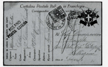 Abb. 9: Feldpostkarte von 1916 aus Italien, gemäss Sonderregelung nur als unfrankierte Inlandkarte (ab Grenze) nach Formel 4 taxiert (Schweizer Kartenporto 5Rappen):2x5 = 10Rappen Taxe. Taxmarke ZU 32.