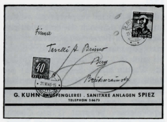 6. Am 7. Mai 1945 wurde verfügt, dass mit ausser Kurs gesetzten Marken frankierte Post im Inland - wir wissen, dass die Gültigkeitsdauer der Sondermarken damals recht kurz war - nur noch nach Formel 3 (einfacher Fehlbetrag) zu taxieren sei, weil ja der Absender für die nun ungültige Marke bereits seinen Obolus entrichtet hatte. Die Post hatte bei den Empfängern ungültig frankierter Briefe immer viel Ärger feststellen müssen, dem sie nun halbwegs auszuweichen versuchte. Sinngemäss war diese Bestimmung auch auf Briefe mit noch nicht gültigen Marken anzuwenden, die «bisweilen» in die Hände der Postkunden gelangten (etwa die von privater Seite verkauften Pro Juventute, aber auch die bereits teilweise am 8. Mai 1945, also nur einen Tag nach Erlass dieser Vorschrift, erhältlichen Pax-Marken) (Abbildungen 17 und 18).