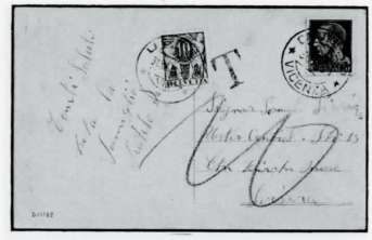 Abb. 10: Feldpostbrief von 1940 aus Frankreich (Fremdenlegion), nur zum einfachen Inlandporto nach Formel 3 taxiert, also 20 Rappen Taxe. Taxmarke ZI/57*.