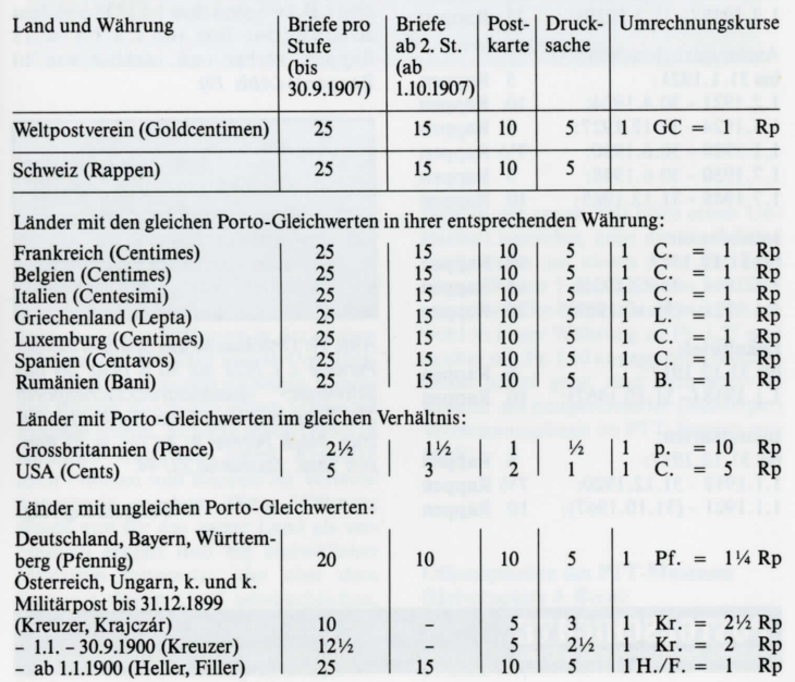 Der Weltpostverein legte dabei die Auslandporti im Verhältnis 5:2: l für Briefe, Karten und Drucksachen fest, oder in Goldcentimen im Verhältnis 25:10:5. Etliche Länder hatten eine gleichwertige Währung; bei anderen stimmten wenigstens die «Verhältnisse»; eine dritte Gruppe konnte oder wollte das Verhältnis 5:2: l nicht anwenden. Bei diesen wenigen Ländern muss man bei der Nachberechnung der Taxen besonders aufpassen. Weil aber die Taxäquivalente von 1875 bis 1921 praktisch stabil blieben, kannte jeder Postler die Umrechnungskurse auswendig und musste den jeweiligen ausländischen Fehlbetrag nur mit dem Umrechnungskurs multiplizieren, ohne sich gross mit dem Bruchrechnen, wie wir es bei der Darstellung der Grundsätze getan haben, abzumühen. Wir führen im folgenden eine (nicht vollständige Liste) der Portogleichwerte und der Umrechnungskurse auf. Anzumerken ist, dass bei den Briefen ab 1.10.1907 eine Portoänderung ab der 2. Gewichtsstufe eintrat (von 25 auf 15 Rappen verbilligt, zum Teil bei Erhöhung der Gewichtslimite pro Stufe von 15 auf 20 Gramm).