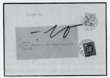 Abb. 14: Die gleiche Drucksache wie Abbildung 13, ebenfalls mit 2,4 Rappen Fehlbetrag, der jetzt nur noch auf die üblichen 5 Rappen aufgerundet werden konnte. Taxmarke ZU50.