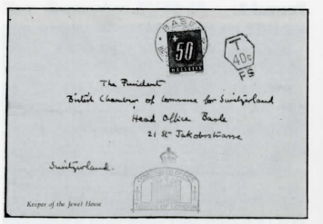 Abb. 16: Unfrankierter Brief aus England vom November 1953, bei einer Schweizer Ausland-Briefgebühr von 40 Rappen, was 80 Rappen Taxe ergeben hätte, nun zur «Billig-Formel» von 50 Rappen (5/8) taxiert. Taxmarke ZU61y.