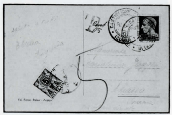 Abb. 13: Minimalbetrag 10 Rappen. Drucksache vom 31.12.1934, dem letzten Tag der Minimaltaxierung von 10 Rappen im Auslandverkehr, aus Italien, mit 20 statt 25 Centesimi frankiert, dies bei 1.25 Lire bezw. 30 Rappen AuslandBrief-Porto, Formel 2:5:725 Centesimi x 30 x 2 = 2,4 Rappen Fehlbetrag. Taxmarke ZU43z.
