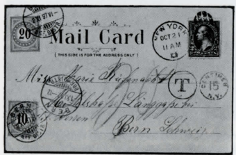 Abb. 5: Noch nicht zum Kartenporto zugelassene Ansichtskarte von 1897 aus den USA, die nach Formel 2 als Brief taxiert wurde. US-Briefporto 5 Cents, Schweizer Auslandbriefporto 25 Rappen: l Cent = 5 Rappen. Es fehlen 3 Cents zu 5 Rappen x 2 = 30 Rappen Taxe. Taxmarken ZU18EIIK, 19FIIN.