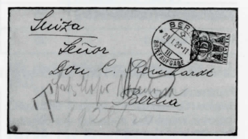 Wir nehmen nun einen deutschen Inflationsbrief, der mit 20 statt 80 Milliarden frankiert ist, womit 60 Milliarden fehlen, bei einem Ausland-Brief-Porto von eben 80 Milliarden Mark. Das Schweizer Auslandporto betrug zu jener Zeit 40 Rappen, die Formel 2 galt noch: